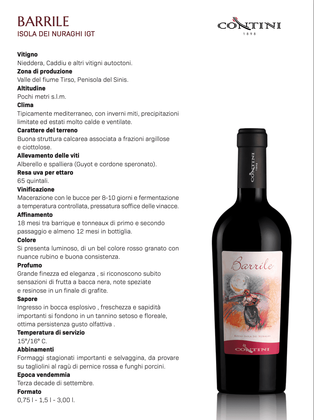 Vino Barrile Rosso- Isola dei Nuraghi IGT 2019 Vitigno: Nieddera, Caddiu e altri vitigni autoctoni. Zona di produzione: Valle del fiume Tirso, Penisola del Sinis (Sardinia- Italy). Affinamento:18 mesi tra barrique e tonneaux di primo e secondo passaggio e almeno 12 mesi in bottiglia. Colore: Si presenta luminoso, di un bel colore rosso granato con nuance rubino e buona consistenza. Profumo: Grande finezza ed eleganza , si riconoscono subito sensazioni di frutta a bacca nera, note speziate e resinose in un finale di grafite. Sapore: Ingresso in bocca esplosivo , freschezza e sapidità importanti si fondono in un tannino setoso e floreale, ottima persistenza gusto olfattiva . Temperatura di servizio: °/16° C. Abbinamenti: Formaggi stagionati importanti e selvaggina, da provare su tagliolini al ragù di pernice rossa e funghi porcini.