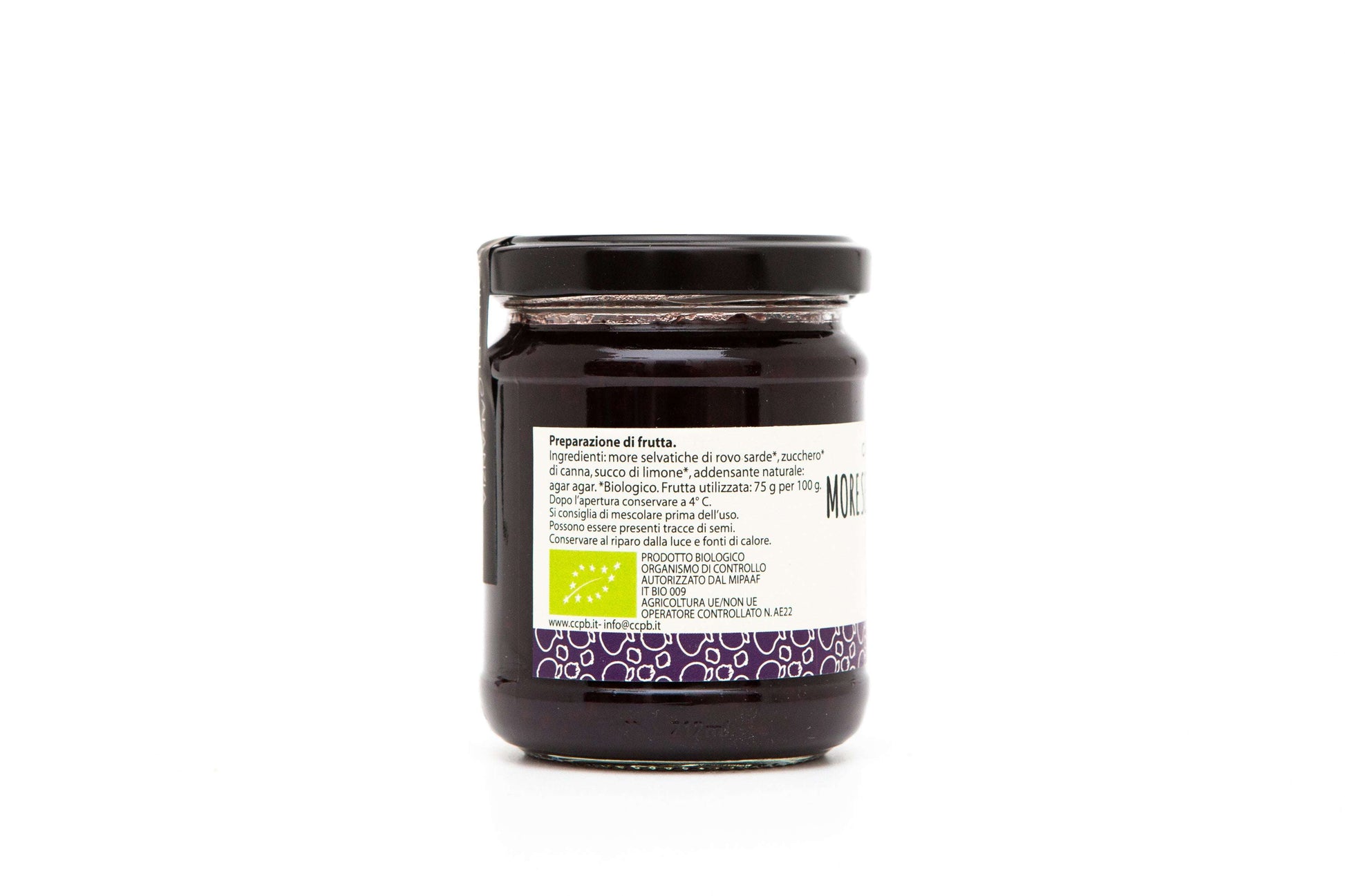 Ingredienti: More di rovo sarde*, zucchero* di canna, succo di limone*, addensante naturale: agar agar. *Biologico.