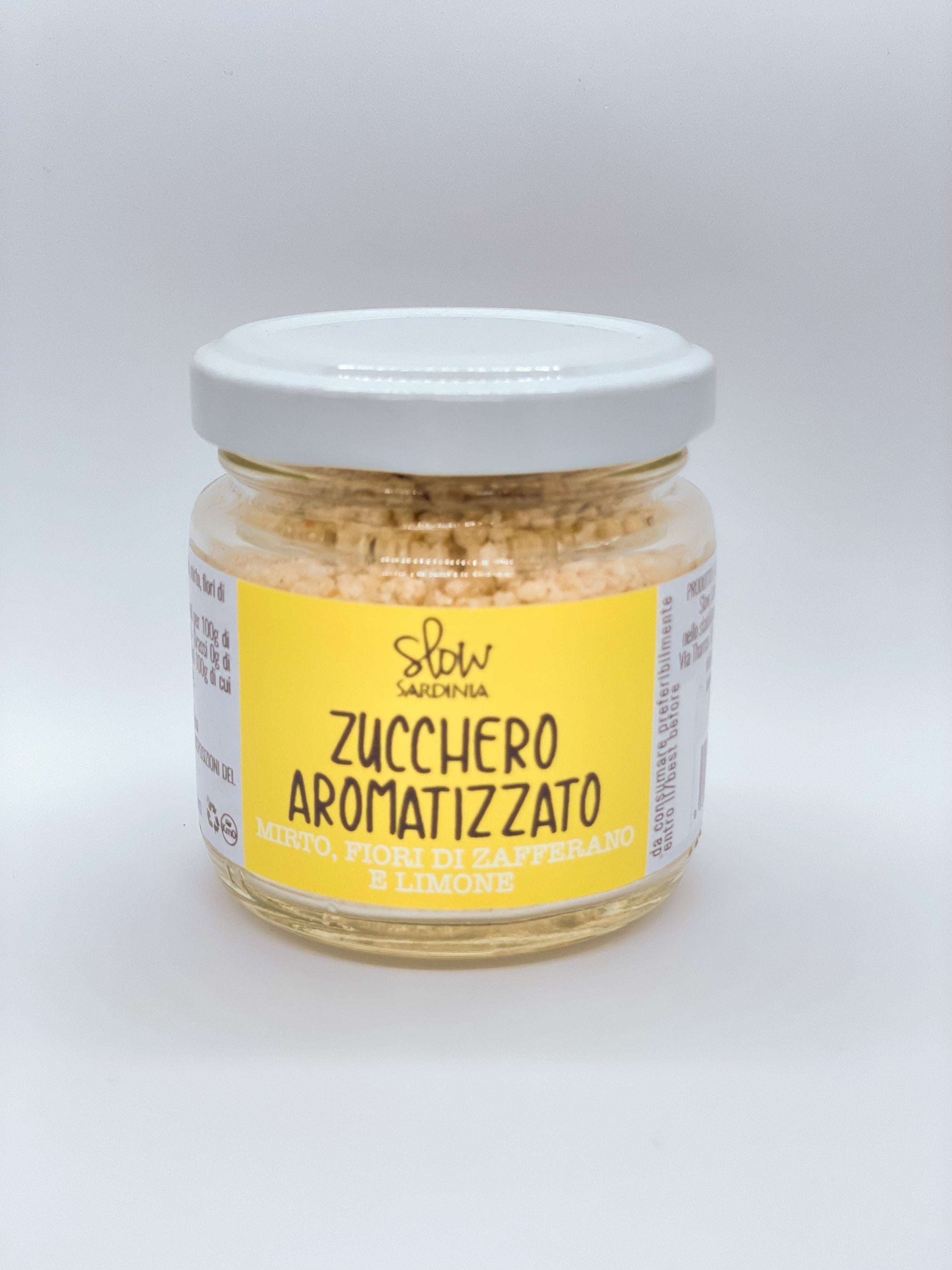 Zucchero aromatizzato al gusto di Mirto, fiori di zafferano e limone.